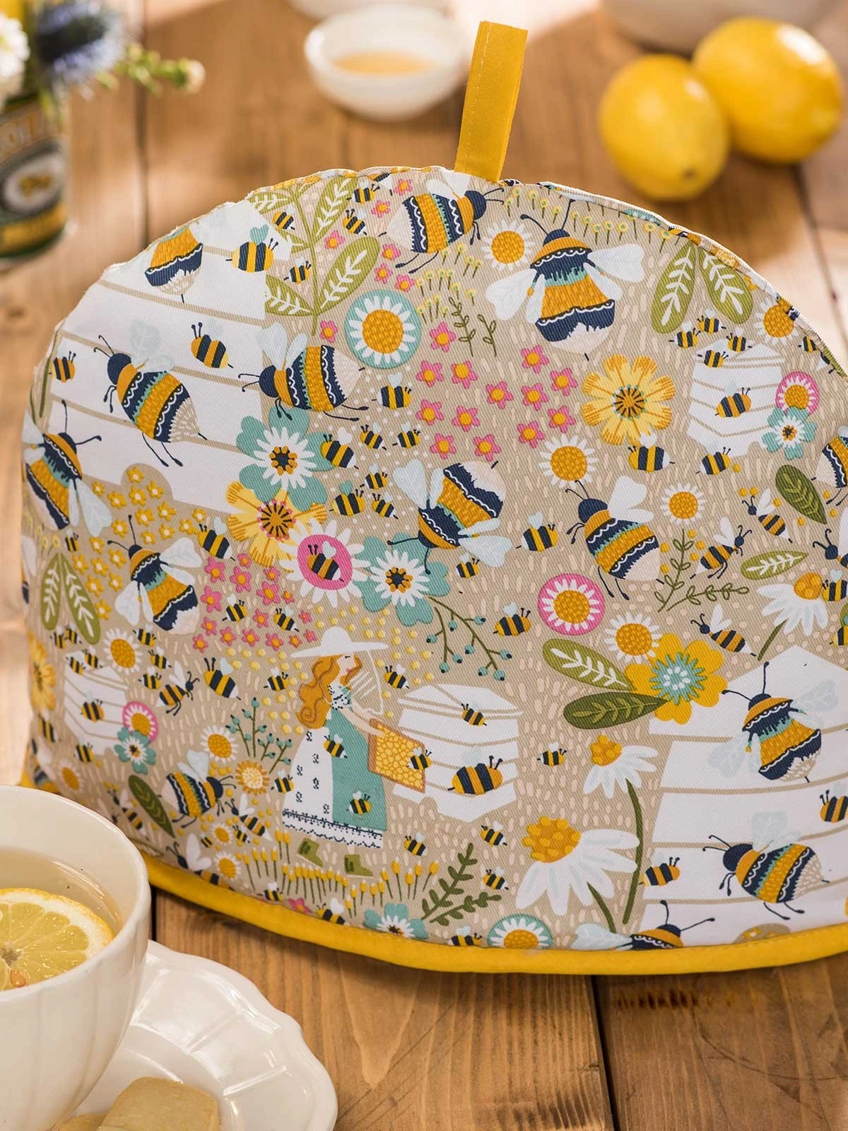 The Bee Keeper design beautifully depicts a wildflower meadow filled with bumbling bees and their keepers. The pops of vibrant colour on the natural oat background ensures that this cotton tea cosy will suit every style of kitchen. The characters caring for their bees is a gentle reminder to us all that we need to protect and care for one of nature’s most important animals.