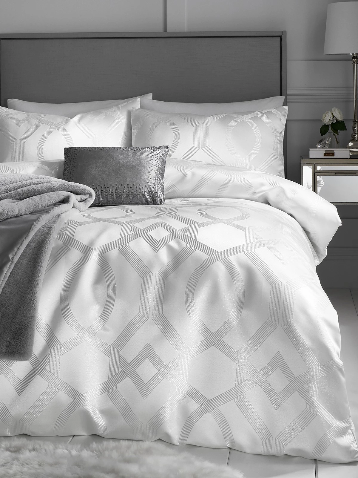 Harlow features a geometric jacquard design with a subtle metallic yarn that softly shimmers as it catches the light. The bedding has a gorgeous heavyweight, soft-touch reverse that feels amazing against the skin. Create your own slice of vintage Hollywood with the new range of homeware by Caprice home. Beautifully designed collections that epitomise Caprice’s own sensational style of sexy, feminine glamour. Spoil yourself with a selection of bedding and accessories that will make you and your bedroom look and feel spectacular. Combine with a choice of luxurious co-ordinating bed throws and cushions to add texture and depth to this stunning and glamorous bedroom look.