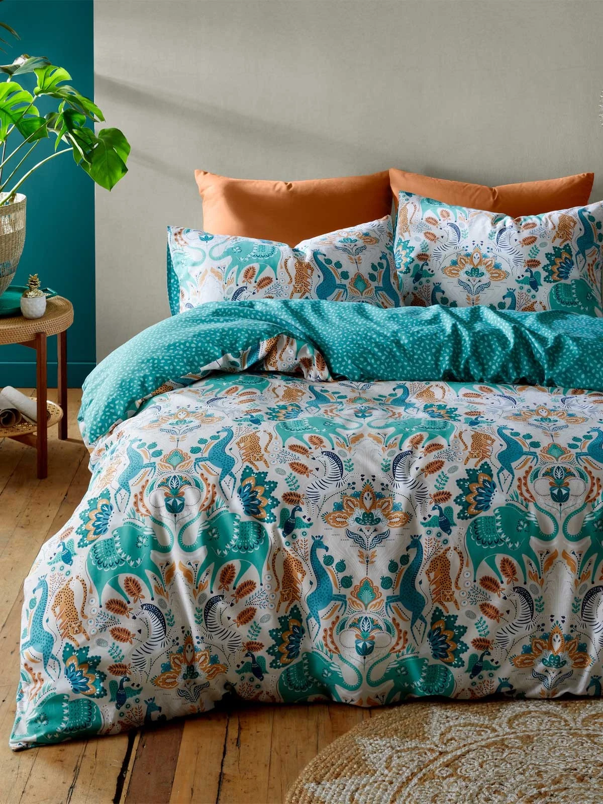 Carnival animals dance across this statement jungle style pure cotton duvet set.