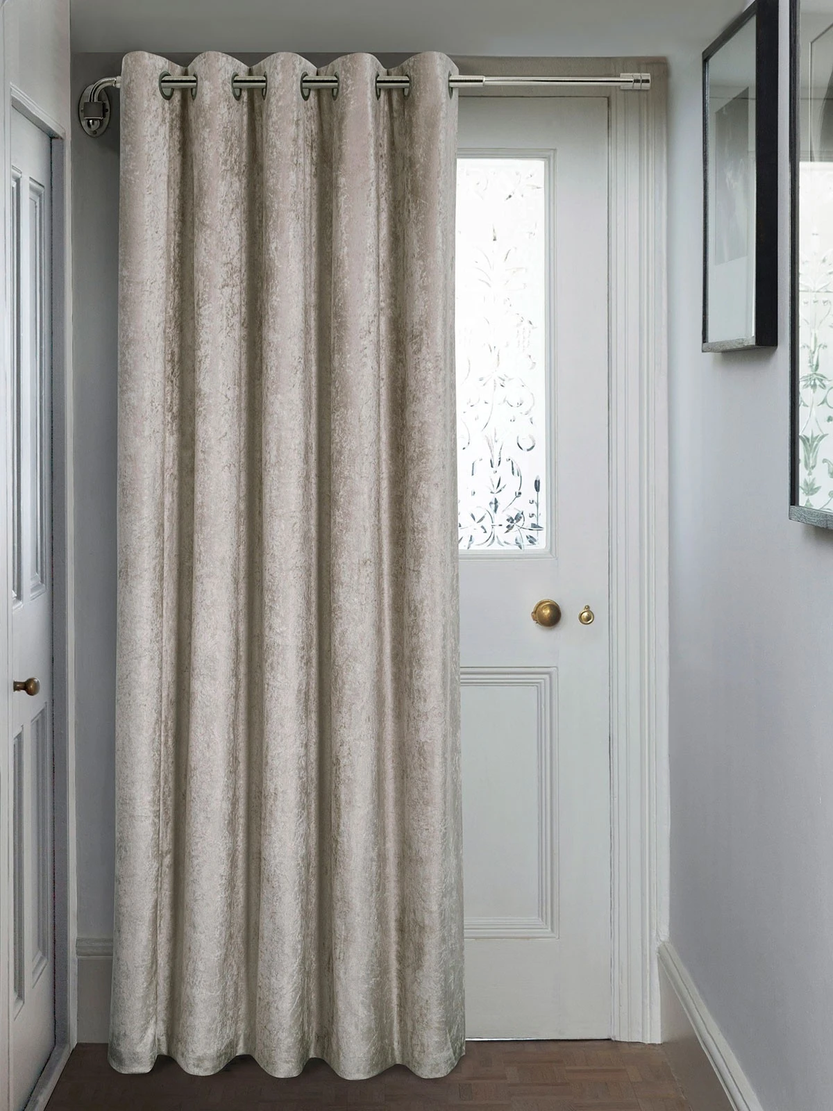 Add a touch of opulence with our sumptuously soft crushed velvet door curtain. Luxurious to the touch, the crushed velvet fabric drapes beautifully and creates a stylish, sophisticated look. The thermal lining provides improved insulation for your home by blocking out cold draughts in winter as well as keeping the heat at bay in summer. Finished with an eyelet header for ease of installation. Sold as a single panel. Pairs of curtains and co-ordinating cushions are also available.