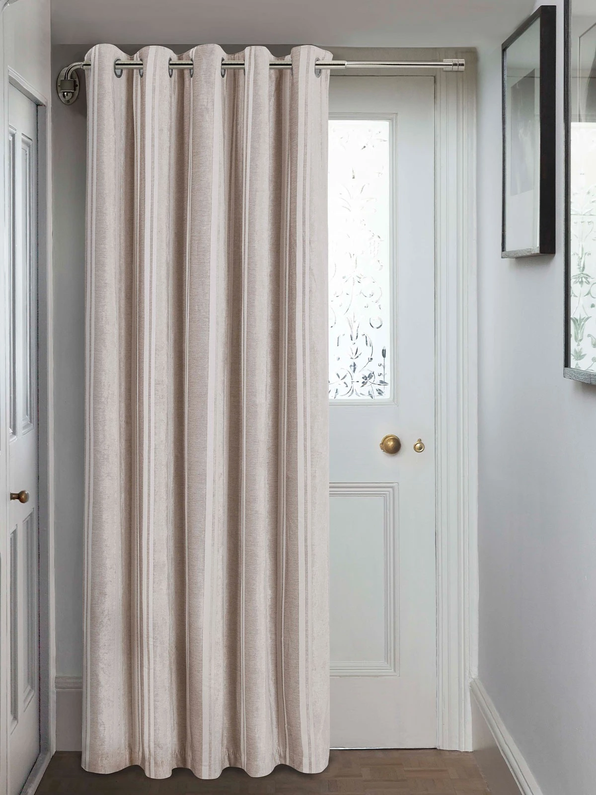 Add a touch of luxury with our sumptuously soft velvet stripe door curtain. The heavyweight velvet fabric drapes beautifully and creates a stylish, sophisticated look. The thermal lining provides improved insulation for your home by blocking out cold draughts in winter as well as keeping the heat at bay in summer. Finished with an eyelet header for ease of installation. Sold as a single panel. Pairs of curtains and co-ordinating cushions are also available.