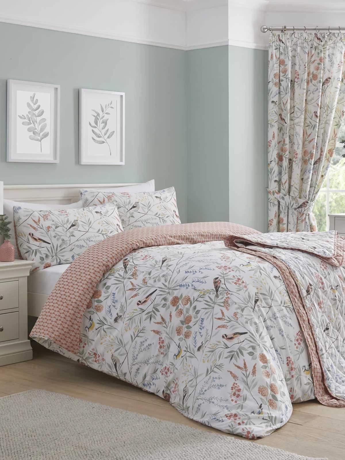 Garden birds flutter delicately across this beautifully hand drawn, floral quilted bedspread that also features an array of garden foliage. The bedspread is double sided and the reverse features a simple print in a soft terracotta shade that offers an alternative look. Made from high quality polycotton, this bedspread is comfortable, durable and easy to care for.