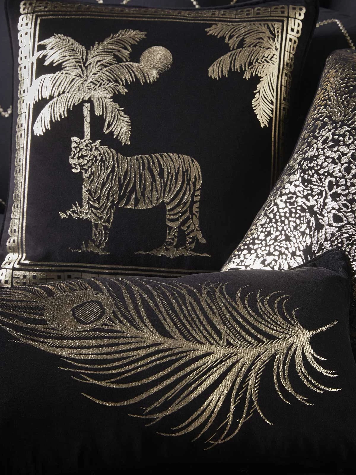 Another dramatic tiger design cushion from Laurence Llewelyn-Bowen. Printed on lavish metallic gold , this soft velvety cushion is a perfect complement to the LLB Sleeping Beauty Collection.