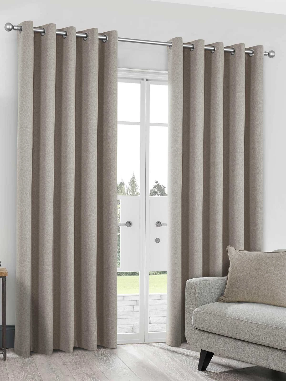 Our Herringbone curtains feature a patented thermal blackout lining which not only provides 100% blackout from light but also blocks out heat in the summer and keeps draughts at bay in the winter. The herringbone weave fabric adds interest to these versatile curtains and the eyelet header finishes the look. Sold as a pair. Also available with a pencil pleat header. Accessorise with the co-ordinating cushion.