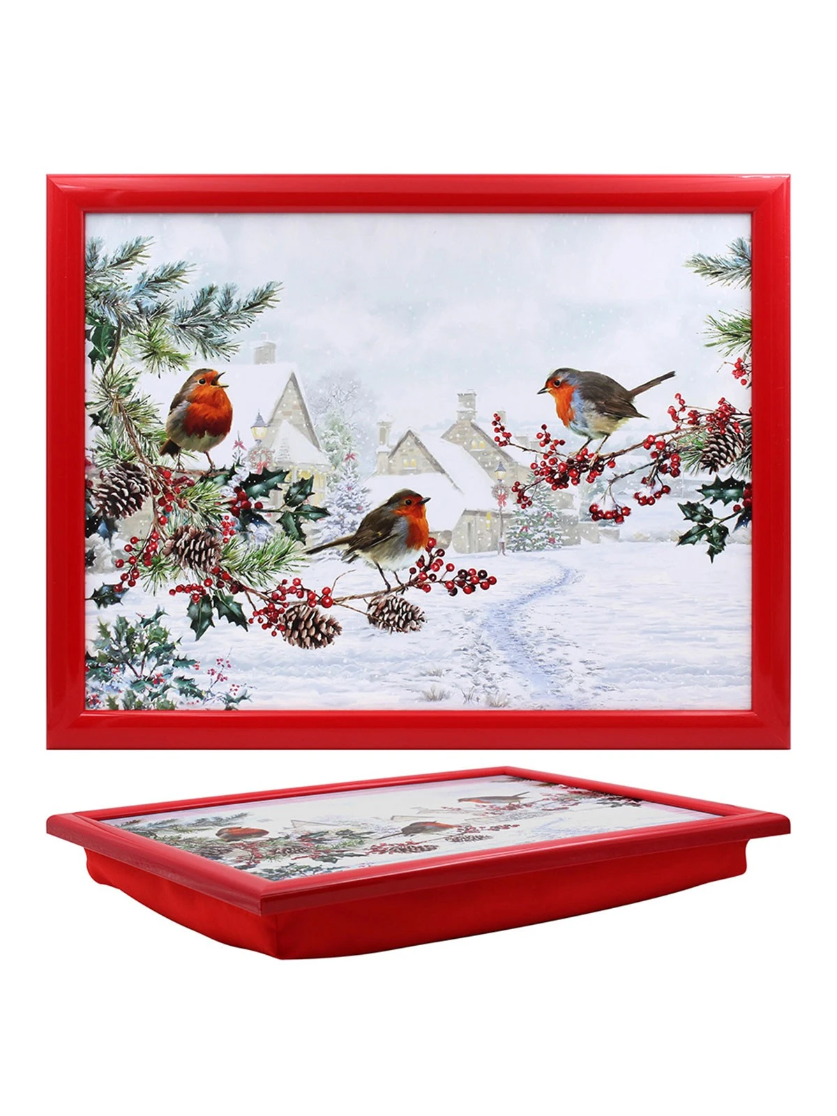 A great solution for informal mealtimes or extra Christmas guests, this laptray boasts a wooden frame on top of a cushioned base. The tray allows food and drink to be served on a flat surface just like a table whilst the foam filled cushion provides a sturdy and comfortable base to place on your lap. The winter robin design adds a festive touch to this practical piece. 44cm x 33cm. Co-ordinating items are available.