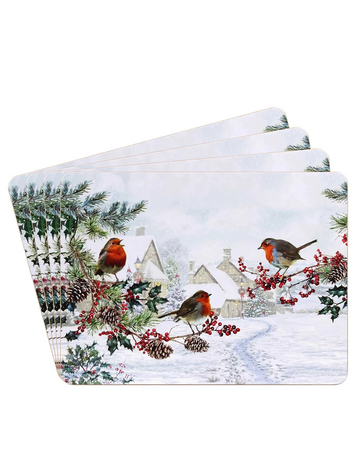 Perfect for protecting your festive table from spills and stains, these winter robin placemats are both practical and stylish. The smooth wipe clean front is easy to care for and the cork back helps prevent scratches and heat marks. Set of 4, boxed. 29cm x 22cm. Co-ordinating items are available.