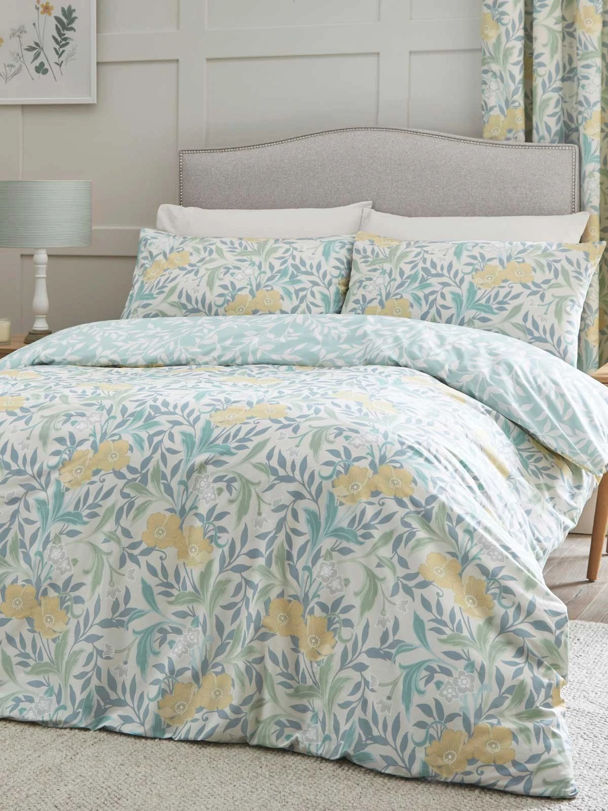 This stunning hand painted, heritage inspired design is the perfect print to brighten up any bedroom. Soft yellow flower heads lie amongst green and blue leaves on an ivory background. The reverse of the design mirrors elements of the same print on a duck egg blue background to offer two great looks in one.