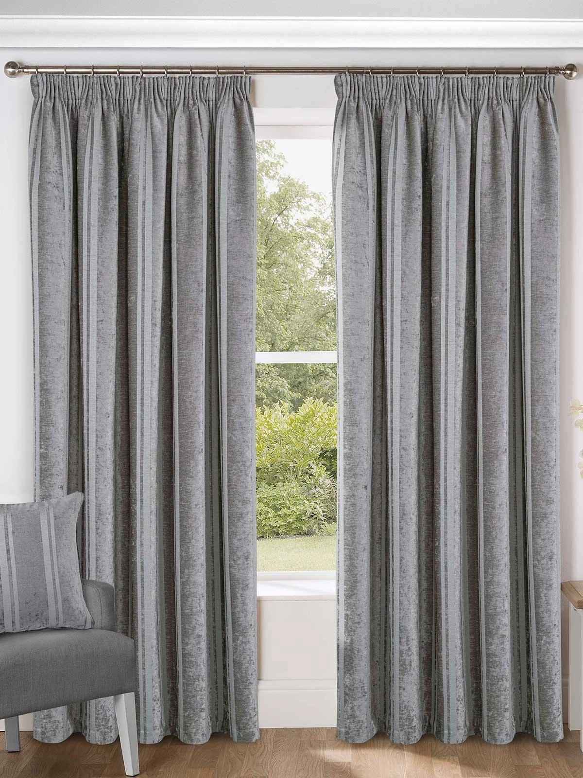 Add a touch of luxury with our sumptuously soft velvet stripe curtains. The heavyweight velvet fabric drapes beautifully and creates a stylish, sophisticated look. With a thermal wadded lining for warmth and a pencil pleat header for a classic finish, these curtains are a great addition to any home. Sold as a pair. Also available with an eyelet header. Complete the look with the co-ordinating cushion.